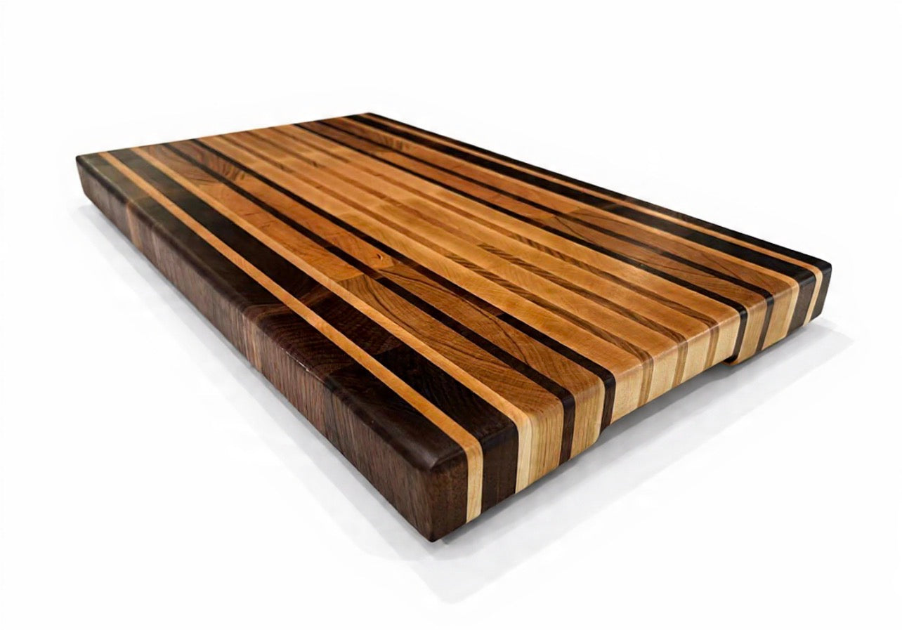 Handcrafted end grain cutting board made from premium walnut, cherry, and maple hardwoods. The durable end grain construction is gentle on knives and built to last, while the natural wood pattern adds a beautiful touch to any kitchen.