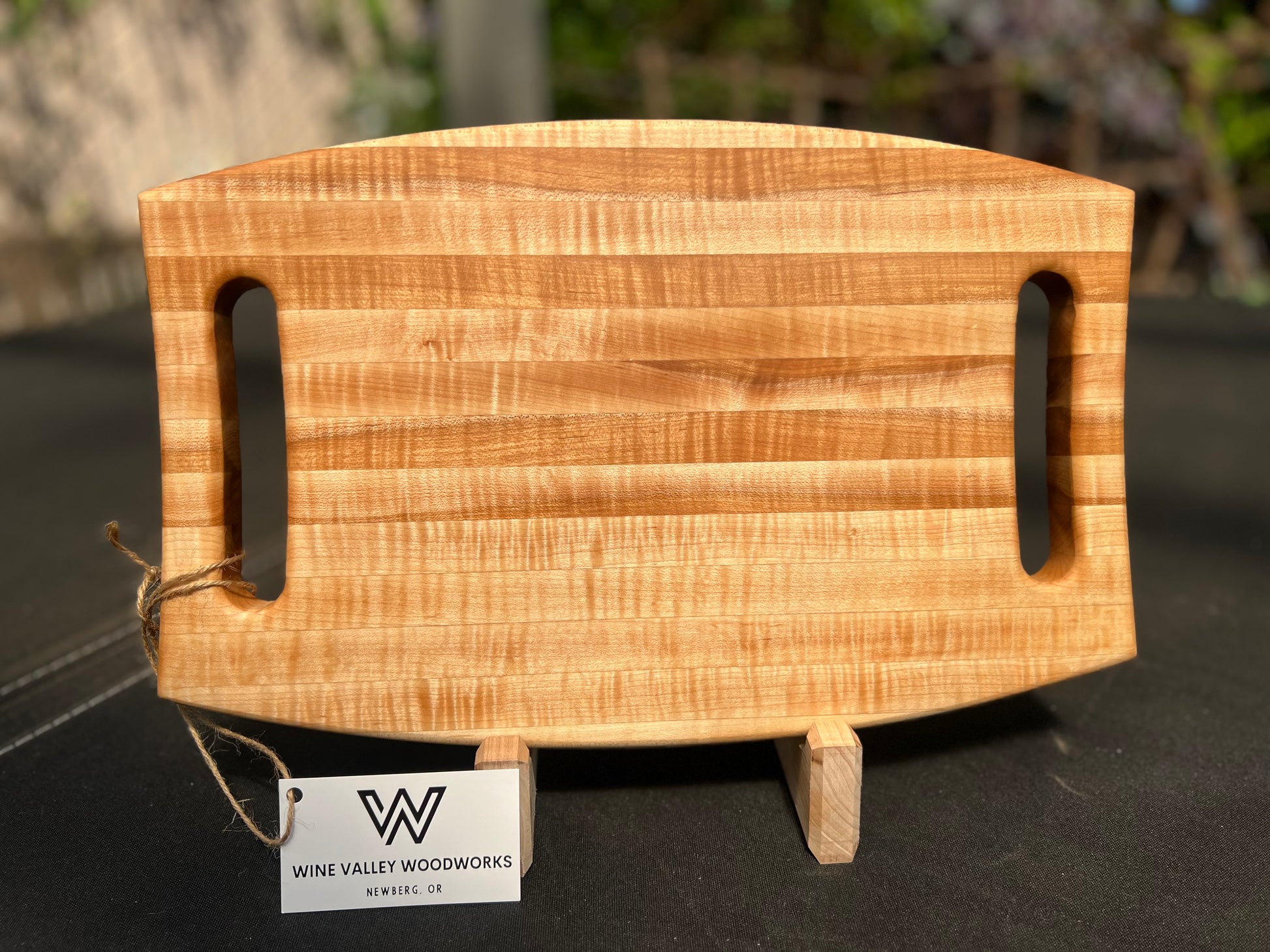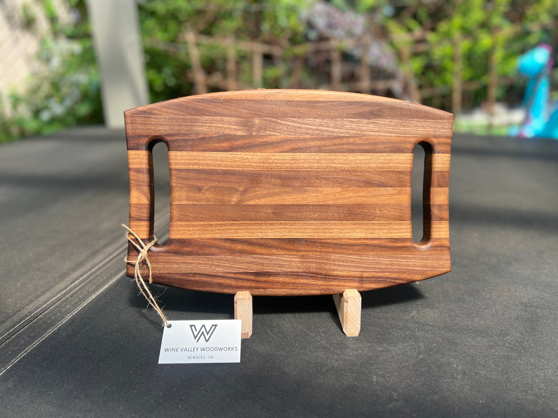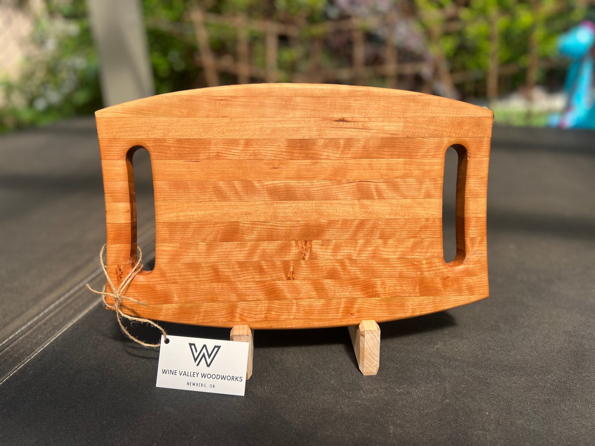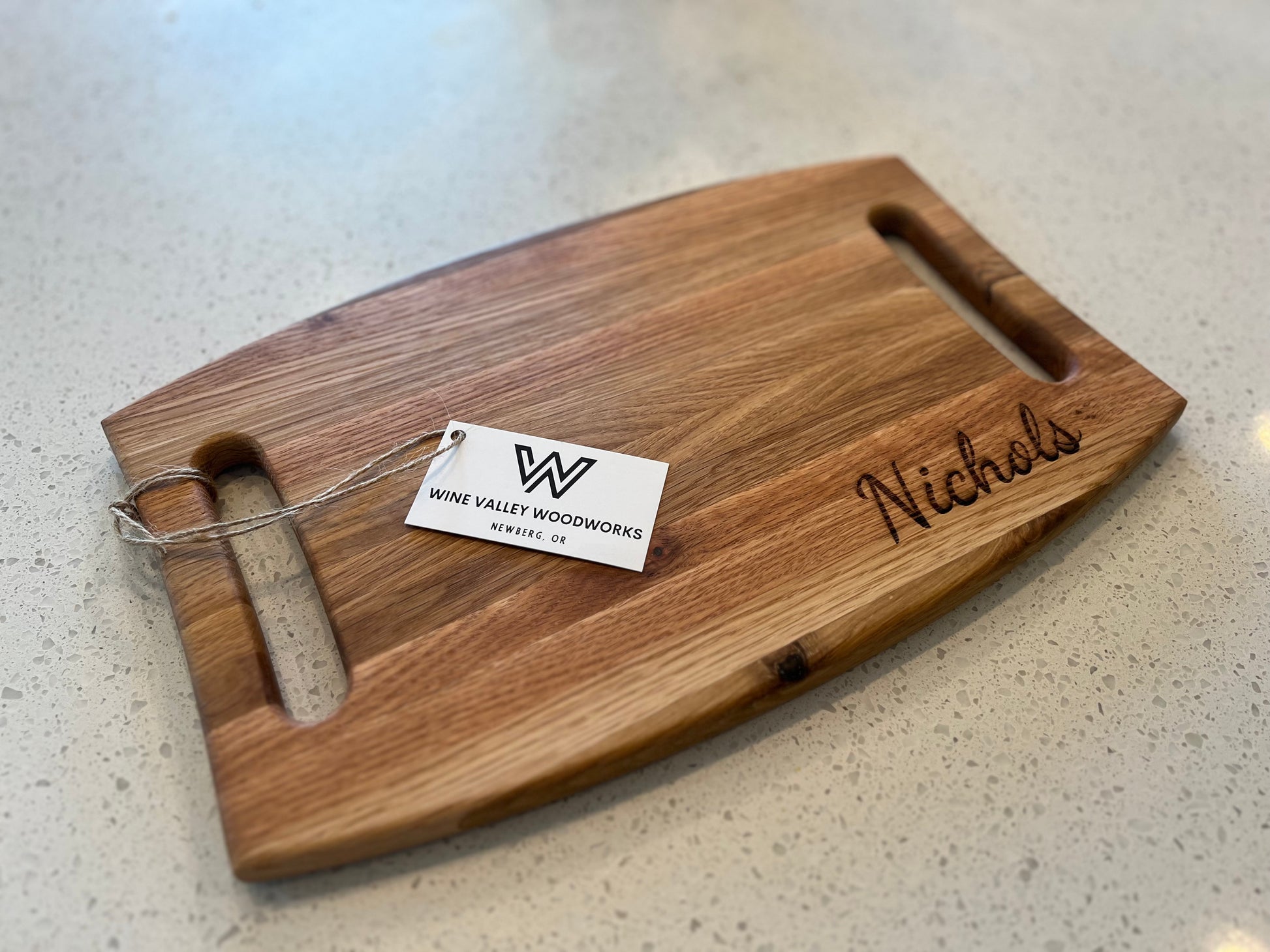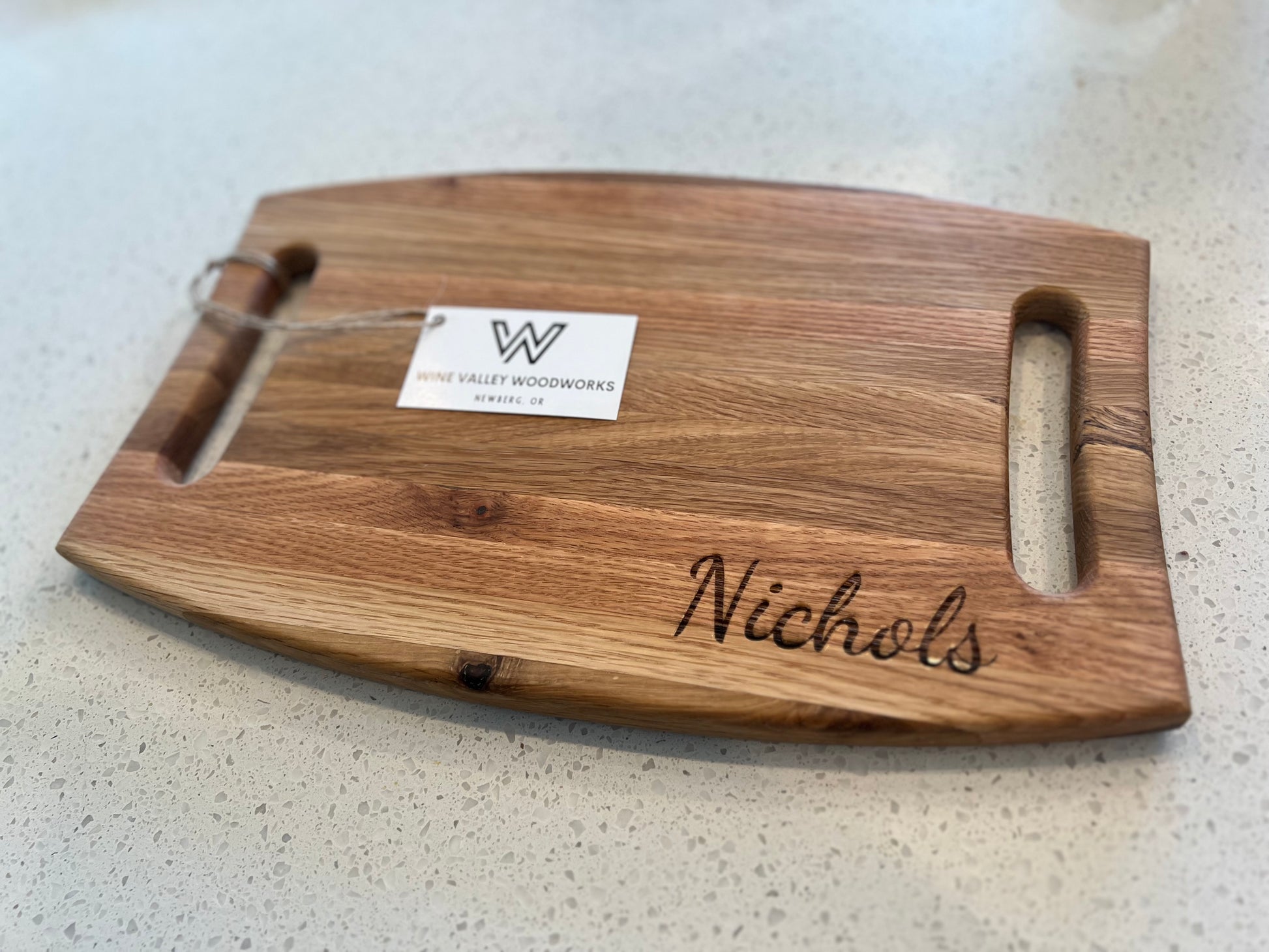 A modern and fluid take on a two-handled serving board. This warped rectangle dual handle serving board is one of our newest designs! It features dual handles that curve to match the curved sides of the board, which is a unique and noticeable detail that sets this design apart from more conventional shapes!